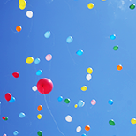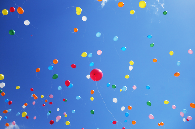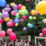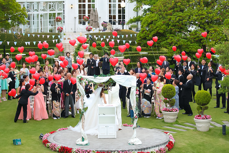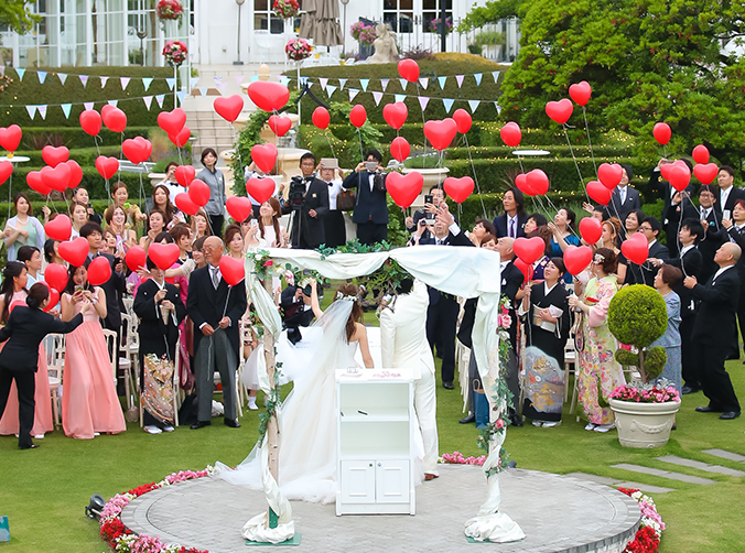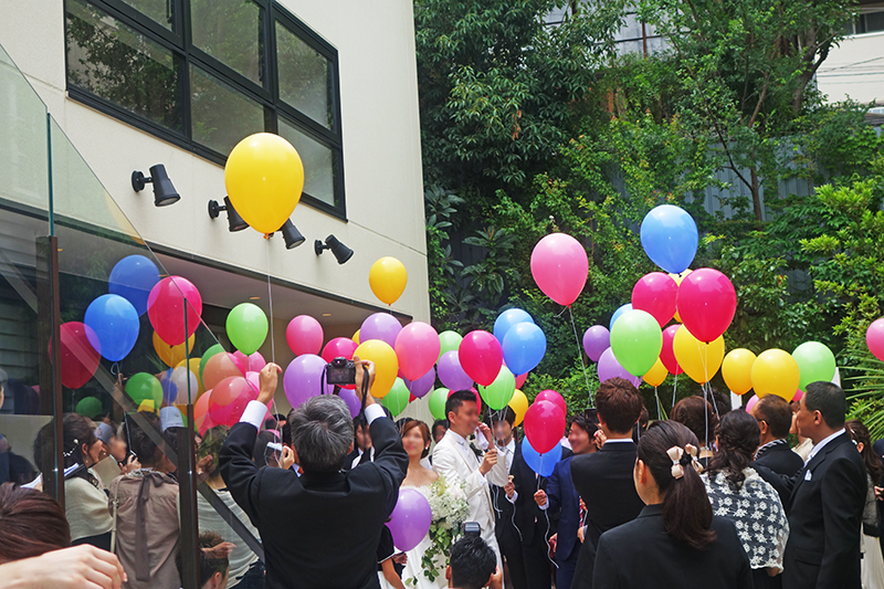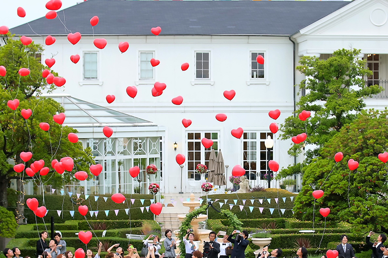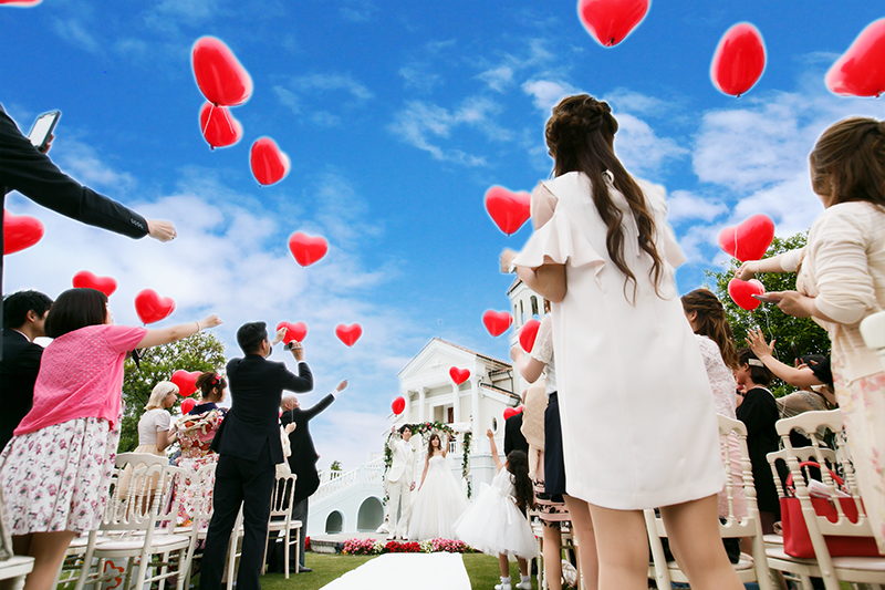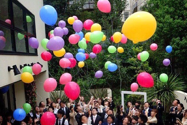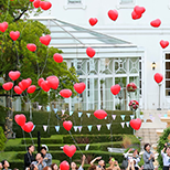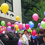 新郎新婦様のお好きな色やテーマカラーにあわせ選んでいただいたバルーンをゲストの皆様と一緒に大空にリリースするゲスト参加型の人気の演出となっています。(リリースの風船には土に返るエコロジー素材を使用しております。)
